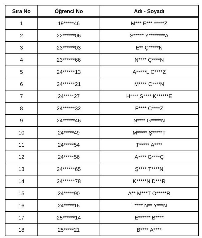 2025-2026 Eğitim-Öğretim Yılı Erasmus+ Öğrenci Hareketliliği Yabancı Dil Seviye Tespit Sınavında Başarılı Olanların Listesi