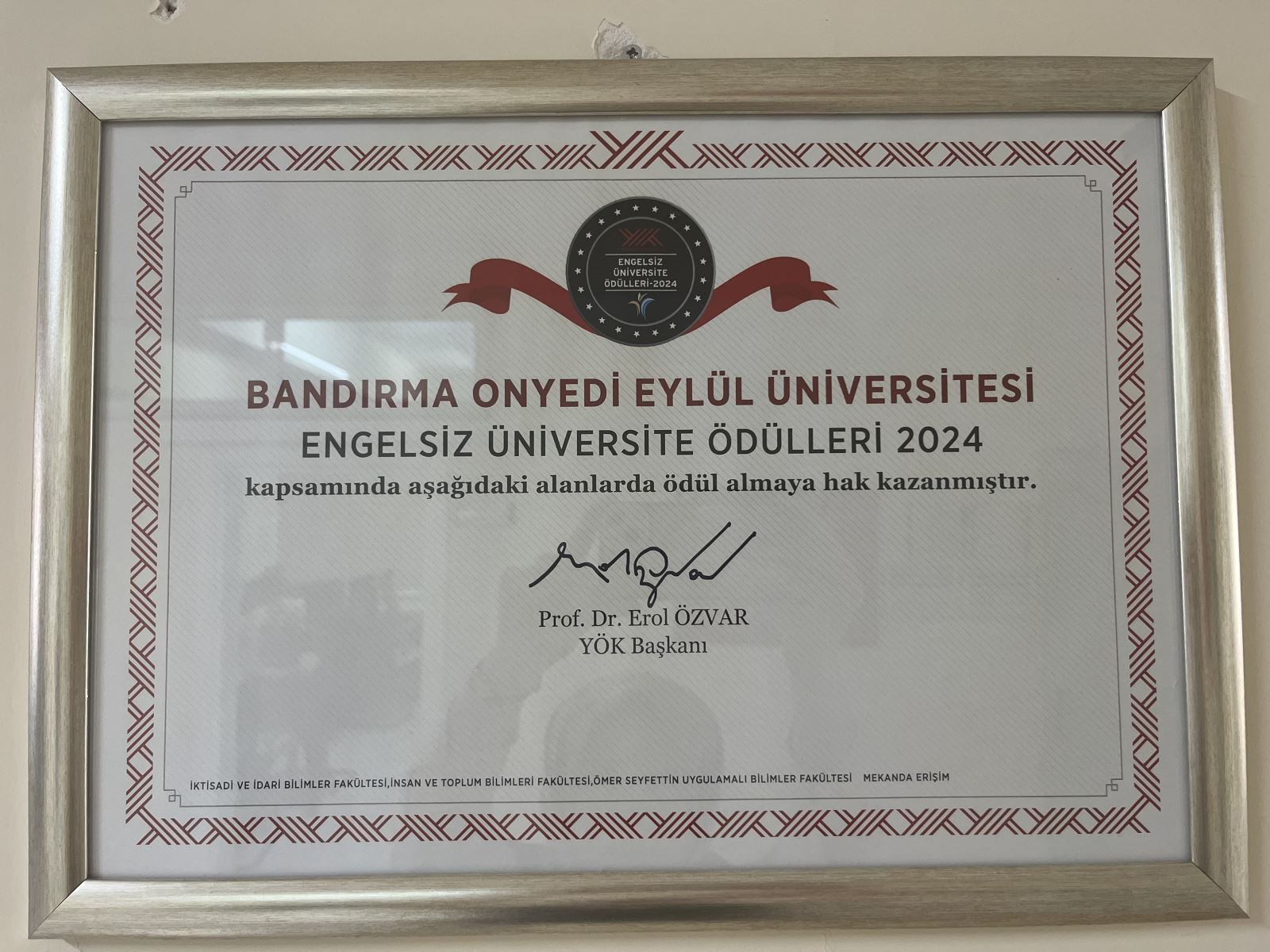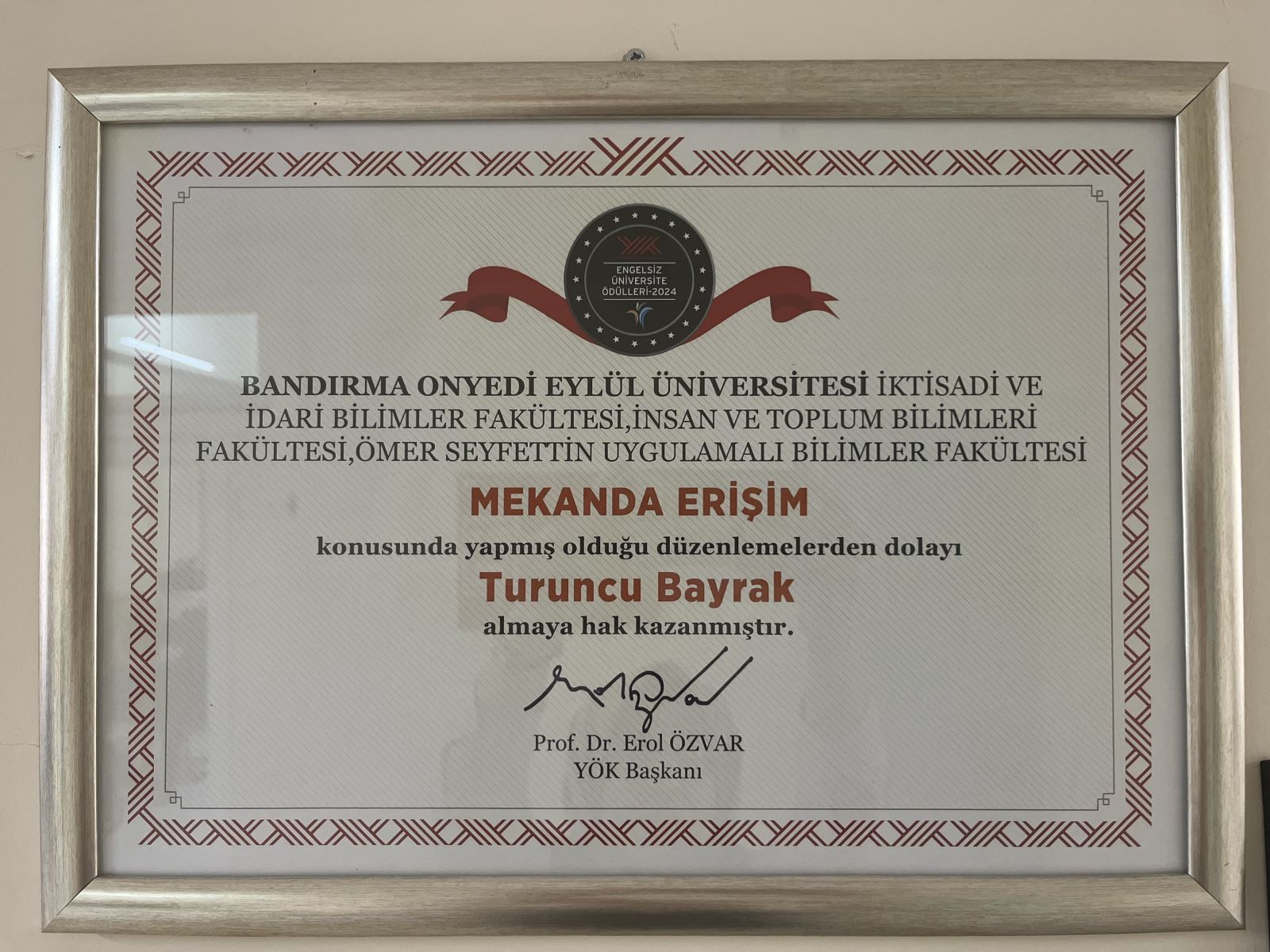 Üniversitemiz, Yükseköğretim Kurulunun “Engelsiz Erişim” ve “Engelsiz Eğitim” temalarıyla yaptığı çalışmalar kapsamında düzenlediği 2024 Engelsiz Üniversite Ödüllerinde turuncu bayrak ödülü almaya hak kazandı.