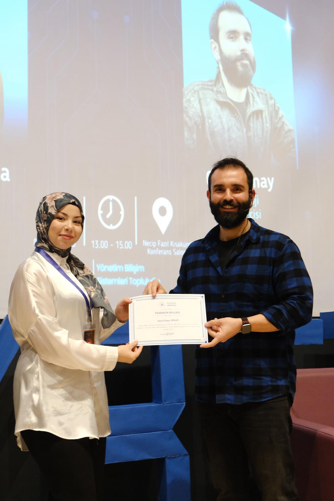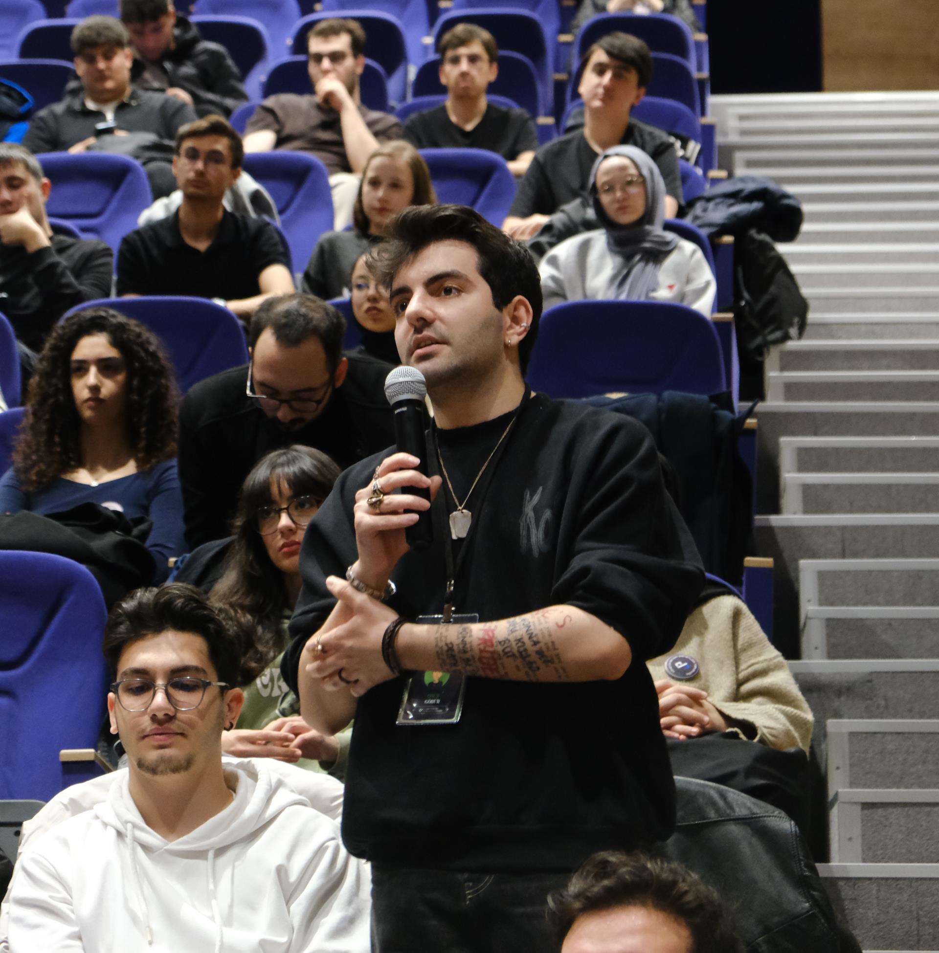 Konferansın ikinci bölümünde Sn. Onur BİNAY, yapay zekanın güncel teknoloji ekosistemindeki rolü, algoritmik yapıların işleyiş mantığı ve gelecekte öne çıkması beklenen dijital trendler hakkında önemli bilgiler paylaşmıştır. Veri güvenliği, dijitalleşme, kullanıcı davranışlarının dönüşümü ve yeni nesil medya teknolojileri, sektörel deneyimler ışığında öğrencilere aktarılmıştır.
