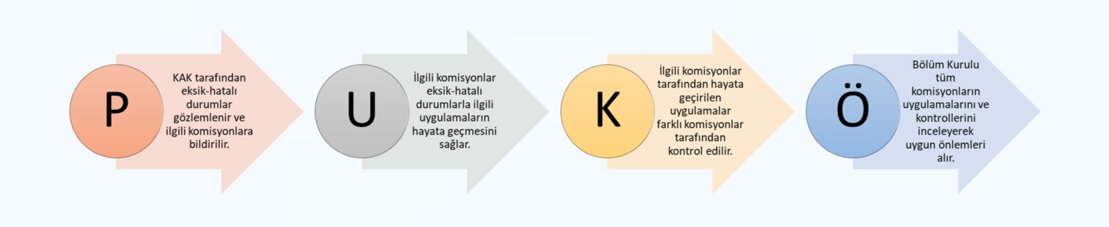 | Sürekli iyileştirme yaklaşımı, kalite güvencesi çerçevesinde planlanmış olup, bölümdeki tüm eğitim-öğretim ve idari süreçler, izleme ve değerlendirme araçlarıyla periyodik olarak kontrol edilmek üzere yapılandırılmıştır. Öğrenci anketleri, paydaş geri bildirimleri, PÖÇ/PEA sağlanım analizleri, komisyon raporları ve akademik danışmanlık raporları bu amaçla kullanılan temel araçlardır. Bu veriler ışığında aksayan alanların tespiti ve iyileştirme fırsatlarının belirlenmesi hedeflenmektedir. | Planlanan süreçler doğrultusunda komisyonlar tarafından toplanan veriler değerlendirilmiş; eğitim planı güncellemeleri, danışmanlık sistemi iyileştirmeleri, altyapının geliştirilmesi ve sektör iş birliklerinin güçlendirilmesi gibi uygulamalara yönelik kararlar alınmış ve bu kararlar, KVKK'ya uygun şekilde komisyon web sayfalarında yayımlanmıştır. | Uygulanan iyileştirmelerin etkililiği, Ölçme ve Değerlendirme Komisyonu tarafından izlenir. Öğrenci anket sonuçları, komisyon raporları, mezun ve işveren anketleri ile kalite göstergeleri düzenli olarak değerlendirilir. Bu değerlendirme çıktıları, yıl sonunda yapılan akademik kurul toplantılarında sunularak resmi karar süreçlerine entegre edilir. Böylece uygulamaların istenen çıktıları üretip üretmediği kontrol altına alınır. | Tespit edilen eksiklikler doğrultusunda iyileştirme politikaları geliştirilmiş, bazı komisyonlar yeniden yapılandırılmış ve organizasyonel görev tanımları netleştirilmiştir. Ayrıca kapanan PUKO döngülerinin ve sürekli iyileştirme faaliyetlerinin şeffaf biçimde izlenebilirliği amacıyla bölüm web sayfasında yayımlanması kararlaştırılmıştır. |